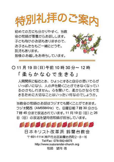 2017年11月19日(日)の日曜礼拝。この礼拝は、当教会の望月信牧師が初めての方にも分かりやすくお話しする特別礼拝です。主題は「柔らかな心で生きる」、聖書は新約・ルカによる福音書8章4節から10節です。礼拝は10時30分から11時45分まで。キリスト教や聖書、そして教会に興味のある方でしたら、どなたでも参加できます。皆さまお気軽にご出席ください。