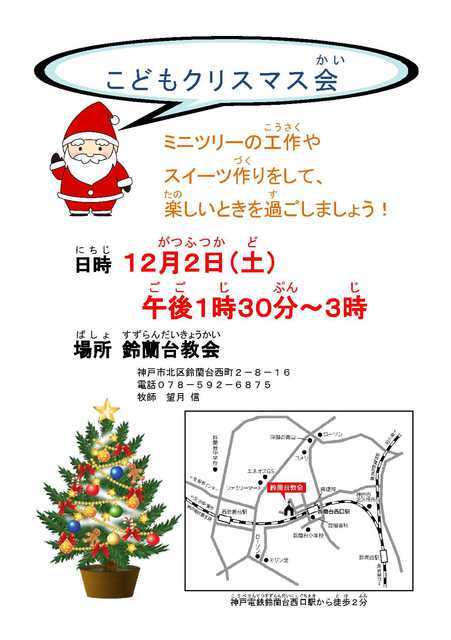 2017年12月2日(土)の午後、「子どもクリスマス会」を行います。ミニツリーの工作をしてクリスマスを迎える準備をします。また、スイーツ作りをして、クリスマスを楽しくお祝いします。