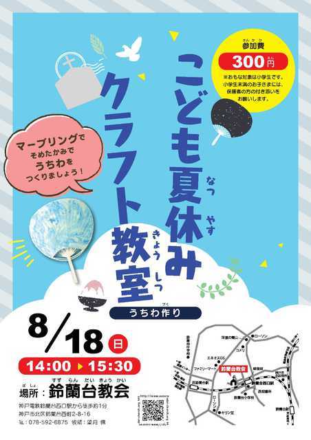 8月18日(日)の午後、「子ども夏休みクラフト教室」を開催します。マーブリングで紙を染めて、自分だけのオリジナル・うちわを作りましょう。子どもたち、集まれ!