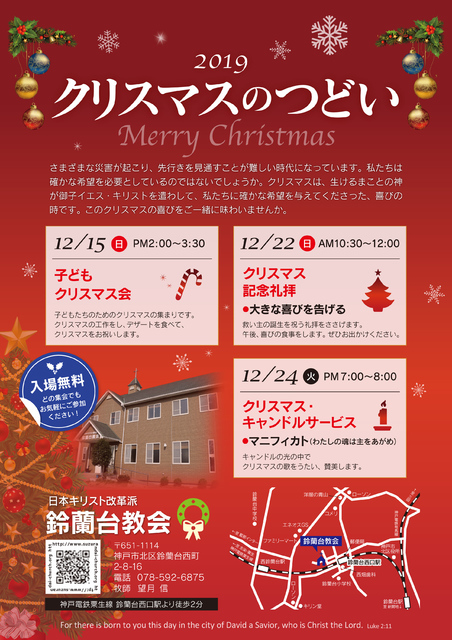 鈴蘭台教会では、2019年のクリスマスの集会を次のとおり行います。どの集会も入場無料です。皆様、ぜひお気軽にご出席ください。